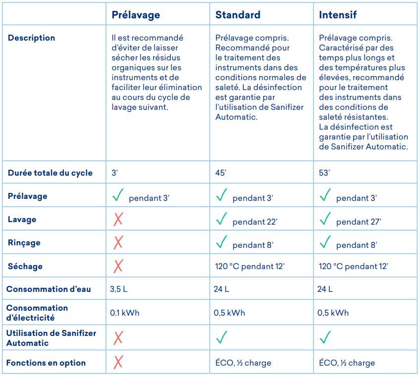 L’eau est chauffée jusqu’à 40 °C, puis le détergent Sanifizer Automatic est injecté, ce qui garantit une action combinée de nettoyage et de désinfection. Grâce à son pH neutre, il convient même aux matériaux les plus délicats, en évitant ainsi les effets oxydants et corrosifs sur les instruments.