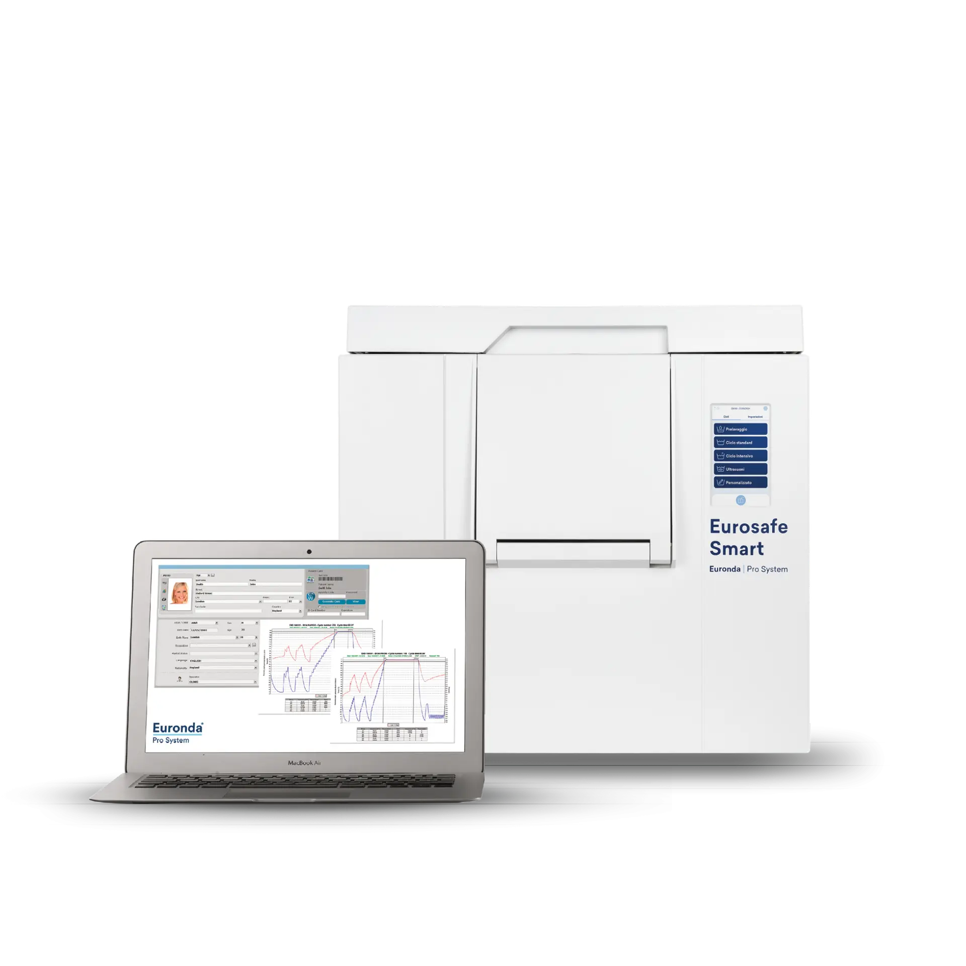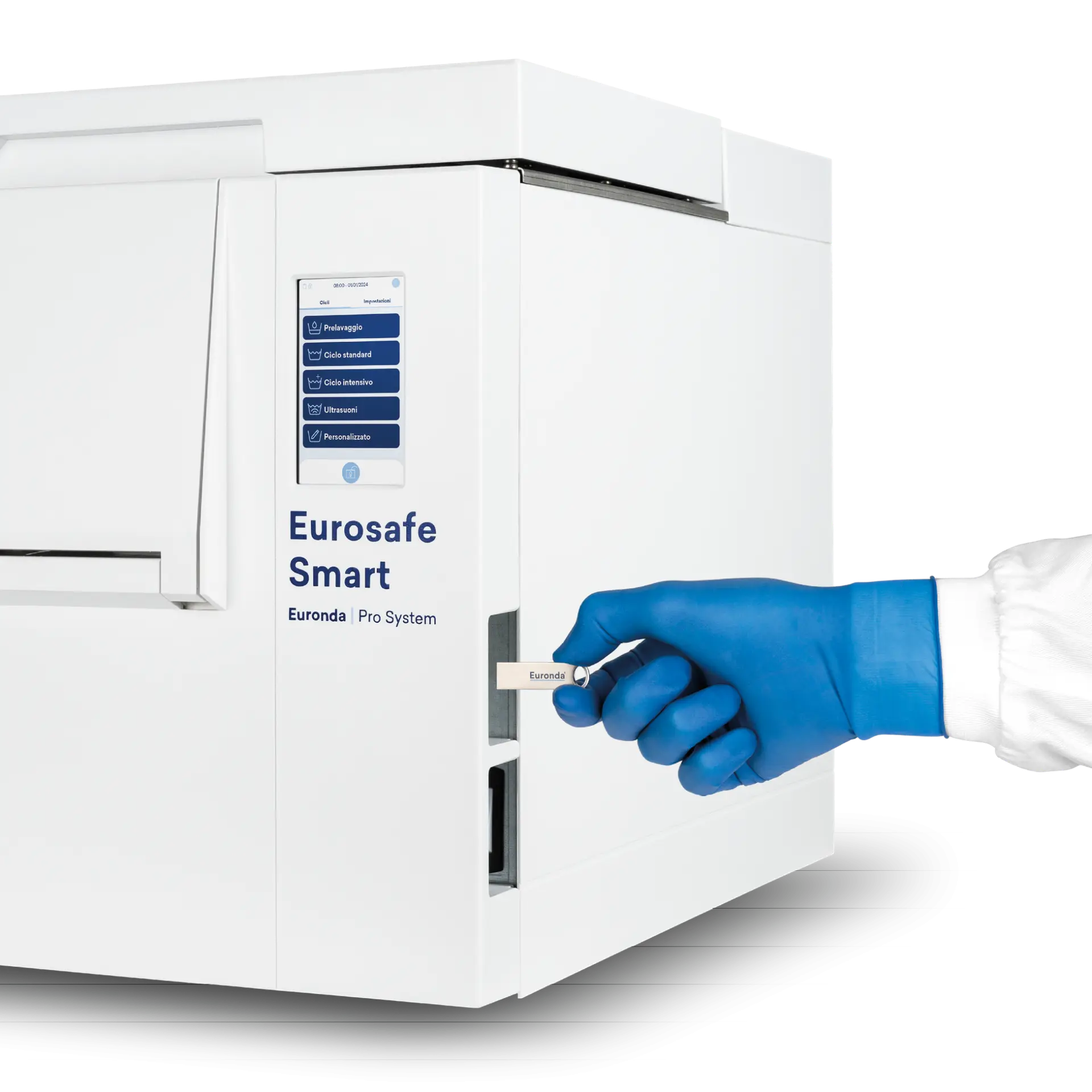 Eurosafe Smart vous permet de garder une trace de tous les cycles effectués : à la fin de chaque cycle, un fichier contenant toutes les données du processus (résultat, durée, quantité de détergent, opérateur) est créé et peut être transféré sur un PC via USB ou une connexion Ethernet (tous deux fournis). Sur PC, les données peuvent être gérées à l’aide de logiciels dédiés : E-Data et E-Memory. Il est également possible d’autoriser jusqu’à vingt utilisateurs, après saisie d’un mot de passe.
